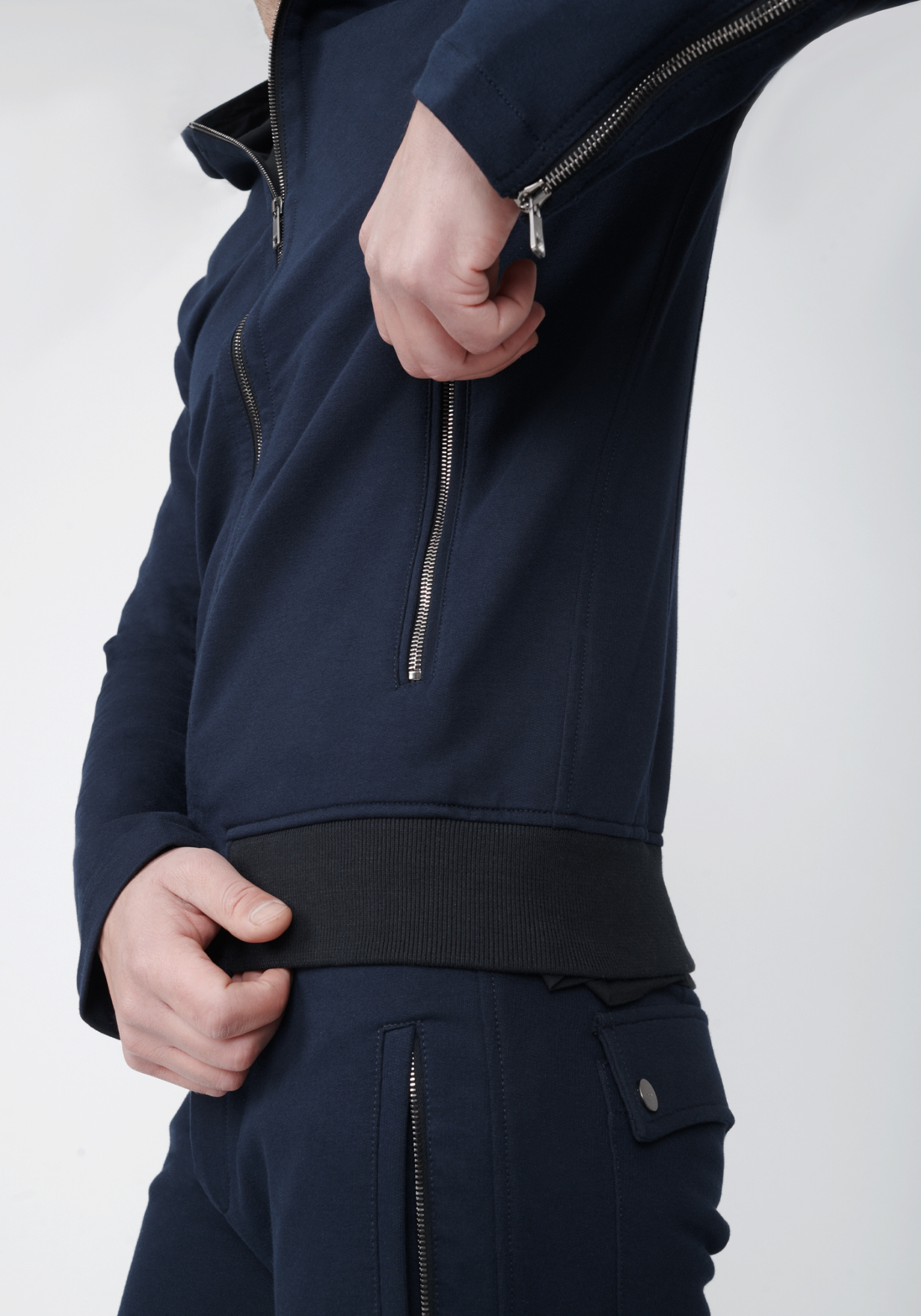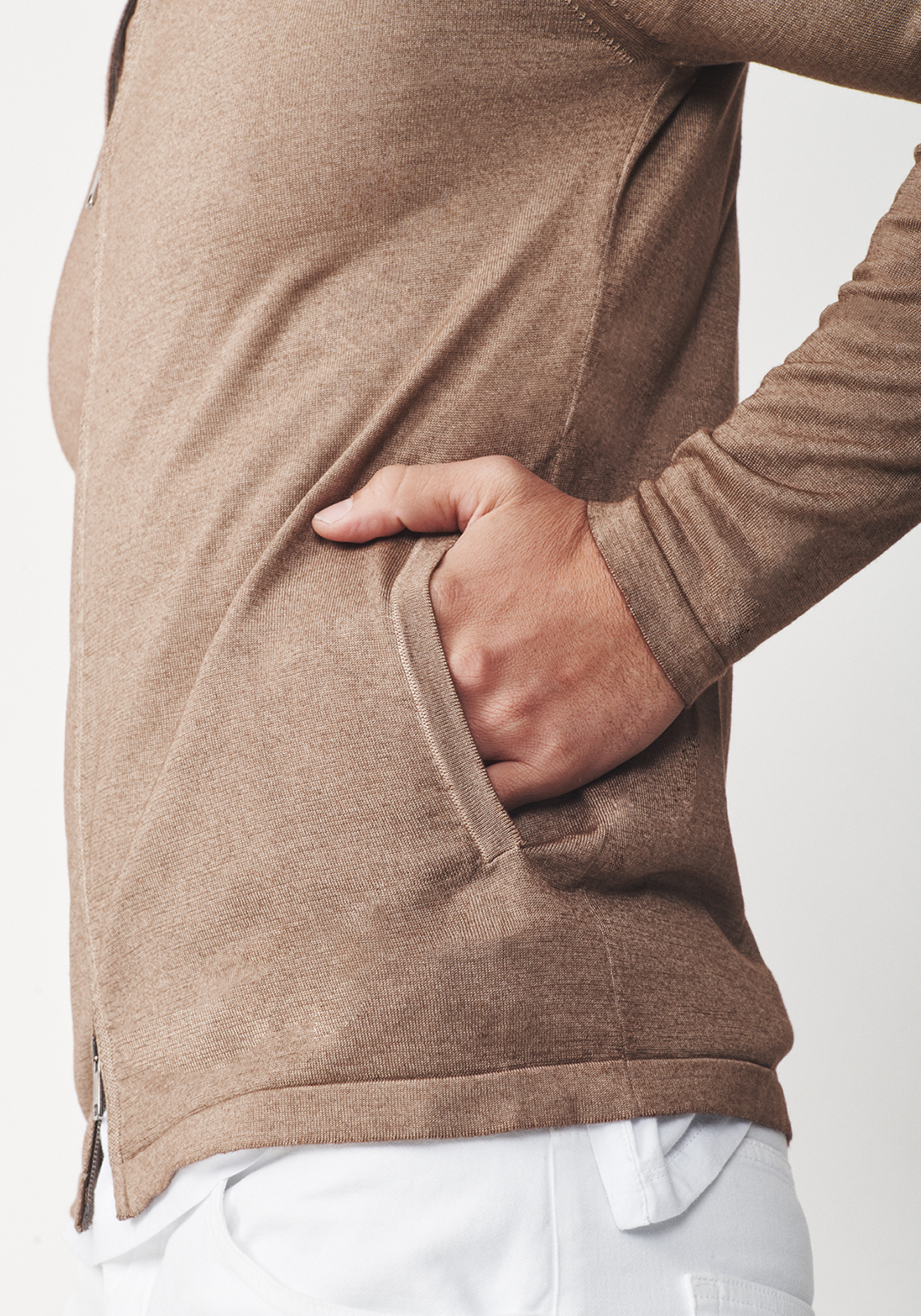 Bien cotton is a heavyweight fabric crafted with a diagonal weave, making it flexible and able to follow movement naturally. The brushed finish gives it a velvety-soft feel while enhancing warmth and insulation. A small percentage of elastane ensures freedom of movement while the garment retains its shape over time.
